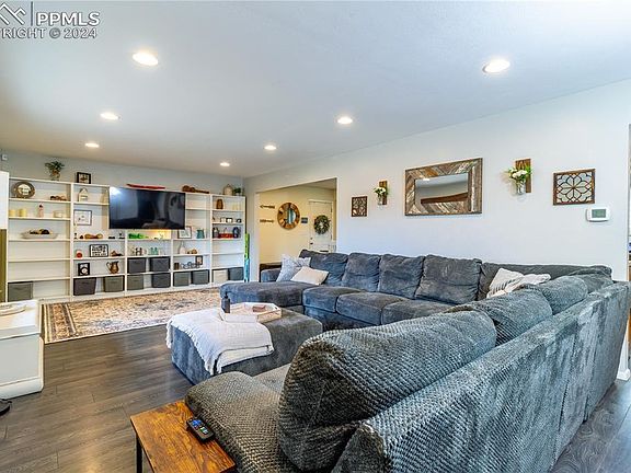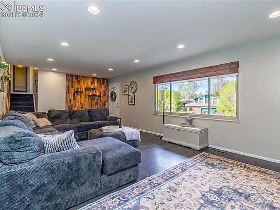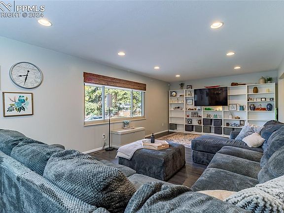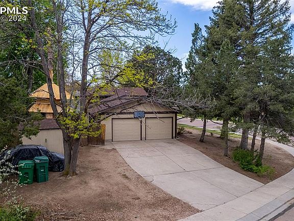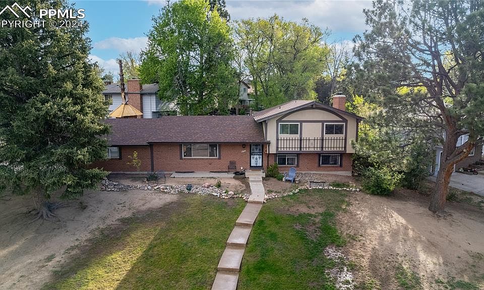 Step inside this exquisite blend of classic brick & stucco elegance nestled on a quiet tree lined street. Each morning, awaken to picturesque views of Pikes Peak, starting your day with inspiration. The heart of the home, a spacious kitchen, is equipped with a gas stove, solid oak cabinets boasting soft-close drawers, and a suite of appliances including a convenient microwave oven. Laminate wood flooring paves the way to cozy gatherings around the wood fireplace in the family room. Natural light pours through vinyl windows illuminating built-in shelving and recessed lighting perfectly placed against the backdrop of stylish window coverings. Entertainment and relaxation extend effortlessly to the walk-out lower level where the family room beckons movies and memorable game nights. A bonus fifth bedroom can transform into your dream home office, while the second family room in the basement has been totally remodeled and is an ideal flex space for an exercise haven or a vibrant play area. Retreat to the remodeled master bath, boasting an enlarged full bath with dual vanities that adjoin the peaceful master bedroom. Central air conditioning ensures year-round comfort, while the treehouses in the yard promise adventure for the young or young-at-heart. Practicalities are covered with new sewer cleanouts, an updated electrical system, a storage shed, RV parking, and a side loader garage. Come, unlock the door to your future and be prepared to fall in love at first sight.