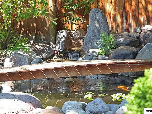 AMAZING SETTING. CLASSIC ONE-STORY HOME. You'll love this classic home set on a corner lot with amazing private back yard. Unwind on the patio amidst the sounds of nature - Koi pond and water feature enhanced by a variety of trees, including Japanese maple, plum, blackberry and blueberry plants, iris, bamboo and more. Private hot tub, deck and garden shed. The inviting floor plan provides access to the outdoors from the master suite, dining room, sun room and your own personal home theater.