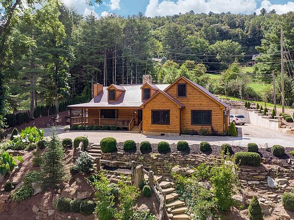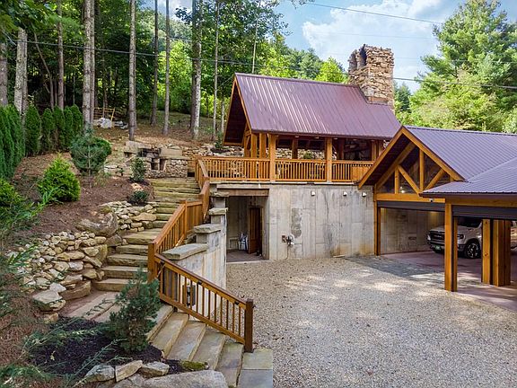 As you pull into the driveway, you will immediately notice the beautiful landscaping & custom mason stonework throughout the entire property, gorgeous timber frame craftsmanship, sound of the Cullasaja River AND the most incredible gazebo fireplace you could imagine! Park in the unique timber framed carport that can remain open or close with retractable garage door sliders to keep the elements out. Enter from the carport into the open kitchen/dining room w/doors to the deck, breakfast bar, stainless steel appliances & granite counter-tops. Dining room opens to the living room w/stacked rock fireplace w/plenty of space to relax! Down the hall are 3 of the main level bedrooms plus a bonus room. Master bedroom w/ensuite bath has dual vanities, soaking tub & shower. All the bedrooms are nice size!! Guest bath & laundry are located close to the bedrooms for ease. Upstairs family room & game/craft/addt'l living space rooms add alot of space to suit your needs. Outside bath & utility room w/shower & dual sinks are located off the carport. Sit on the lower terrace by the fire pit & listen to the Cullasaja River while enjoying the short range mountain views.