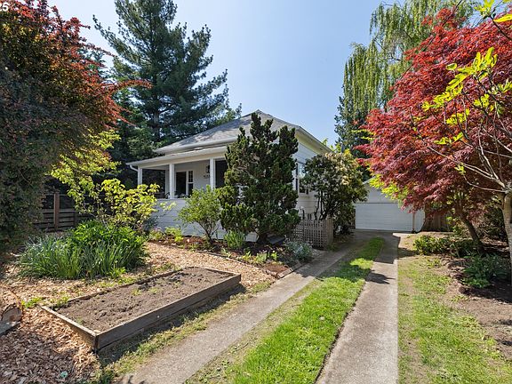 This gorgeous 1904 bungalow is a rare gem that perfectly blends vintage charm, urban homestead vibes, and modern updates, all in a stellar close-in SE location. Situated on an oversized ~9000 sq ft lot, this home offers an open floorplan with tons of customization possibilities. Enjoy an open, light-filled living area with views of the surrounding foliage. The heart of the home is a lovingly renovated kitchen featuring reclaimed oak countertops, restored original hardwood floors and ceiling, custom cabinetry, and modern appliances. Tall ceilings, large windows, and a thoughtful layout make the home feel spacious and bright. A separate office offers flexible space for work, guests, or nursery. The magic continues outside: a show-stopping catio (featured in Catio Tour + KPTV!) connects both levels of the house, and the expansive backyard is a permaculture-inspired paradise with fruit trees, berries, veggies, native plants, and 8 cedar garden boxes. The covered front porch and pergola create year-round outdoor living. Huge detached 2-car garage—ideal for a workshop or creative space. Updates include Milgard windows, central A/C, insulation, heat pump water heater, updated electrical & plumbing, and more. The basement has 6.5’ ceilings and exterior access—tons of potential for expansion or ADU (buyer to verify zoning). Just steps to Coffee Beer for a caffeine hit or libation, blocks from Trader Joe’s, bars, and restaurants, and near major bus/bike routes. Whether you’re a gardener, cat lover, young family, or all of the above, this unicorn of a home is a one-of-a-kind find in this price range. Come see why the owners fell in love with this adorable abode! [Home Energy Score = 8. HES Report at https://rpt.greenbuildingregistry.com/hes/OR10236836]