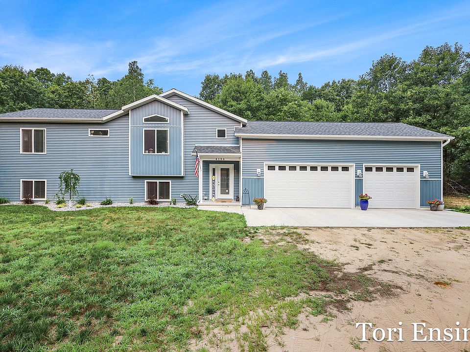 This 2021 build is not your average bi-level. Main floor has cathedral ceilings & 9ft side walls. Large open kitchen, dining and living room. Sliders to a great sized back deck. Owners suite with attached full bath. Additional bedroom and full bath finishes the main floor. Lower level is finished with 3rd & 4th bedrooms, another full bath, 2nd living room, laundry & storage! Outside you will find an over sized 3-stall attached garage with 8 ft doors. 32x56 detached pole barn with 12x12 door, kitchenette, and full bathroom with water & electric. More than enough space for all your toys! Private 2.86 acre lot & A/C. Schedule your private showing today!