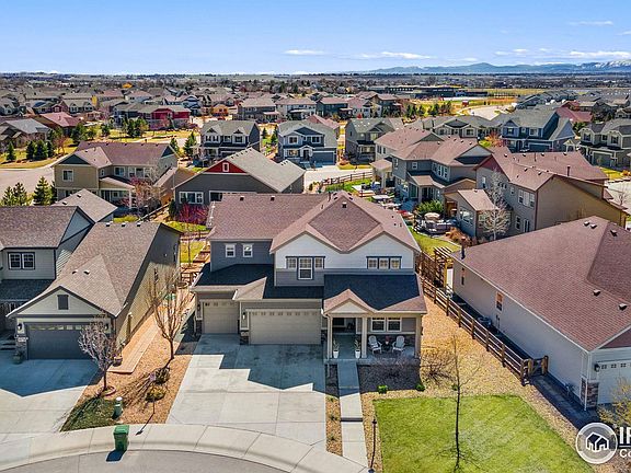 Nestled in a serene cul-de-sac, this extraordinary residence offers the epitome of luxurious suburban living in a highly desirable location. Situated near parks, walking trails, and lakes perfect for kayaking adventures, residents also enjoy the convenience of nearby shopping and easy access to I-25, making commuting a breeze. With meticulous attention to detail, this solar-powered home with a backup battery, boasts upgraded finishes and a thoughtful design that exudes elegance and functionality. Spanning 4,581 square feet, the open-floor concept seamlessly integrates spacious living areas, highlighted by large windows that flood the interiors with natural light, and enhanced by 9-foot ceilings and 8-foot doors throughout. The main level greets you with hardwood floors, a versatile office/flex room, a beautiful staircase with wrought iron railing, and a cozy fireplace adorned with quartz stacked stone. The gourmet kitchen is a chef's delight, featuring, double ovens, gas range, a pot filler, soft-close cabinets and drawers, an oversized island, and stainless steel appliances, all accentuated by exquisite quartz backsplash and granite countertops. Upstairs, the oversized primary suite pampers with a large walk-in closet and a luxurious 5-piece bathroom. Two additional bedrooms share a well-appointed bathroom, while a fourth en-suite guestroom ensures comfort and privacy for visitors. Entertain effortlessly on the oversized 13x26 partially covered deck, overlooking the expansive yard. The fully finished and insulated oversized 3-car garage offers ample space for vehicles and storage, complete with an EV charger, a built-in tool bench and storage solutions. With in-ceiling speakers adding to the ambiance and every detail meticulously crafted, this remarkable home presents a rare opportunity to experience luxury living at its finest.