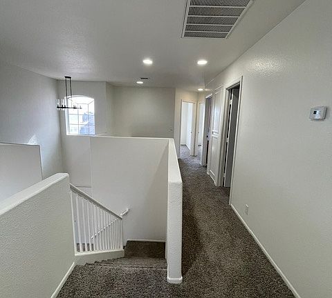 Established family neighborhood with great schools and close to lots of dining, shopping and entertainment nearby. Grand tiled entry with vaulted ceilings and lots of natural light. New carpet and fresh paint inside and outside. Upstairs are 3 great sized bedrooms with an additional large primary with an ensuite. Ceiling fans are in all 4 bedrooms. Upstairs is open and spacious with recessed lights and a study area that can be shared. The 2nd bathroom upstairs has a combination bath/shower and plenty of storage. The Primary has a vaulted ceiling with Plantation shutters and an ensuite with double vanity and a double walk-in shower with privacy screen and built-in storage at each end. There is a separate tiled toilet area with a window. The primary also has a very large walk-in closet. Heading downstairs there is a large living area connected to a carpeted dining area. There is also an additional living area that can be viewed from the large eat-in kitchen that is tiled and has an electric range and a dishwasher. There is also a half bathroom for guests and a great sized laundry room that leads to the oversized two-car garage. The backyard is spacious with a finished concrete pad and mature plants.