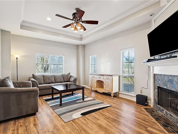 The living room boasts a tray ceiling, elegant crown molding, and a cozy corner wood-burning fireplace. Large windows in the dining room allow for an abundance of natural light. The kitchen features granite countertops and a range/convection oven, perfect for culinary enthusiasts.