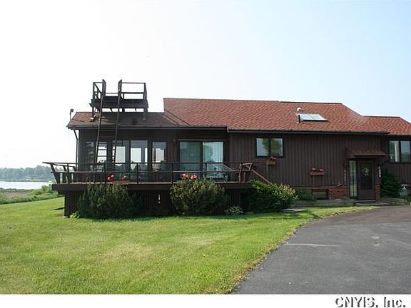 Pristine waterfront property with Shipping Channel and Bay views from interior with lots of glass, or from decks, patios or rooftop widow`s watch. Has spacious, level, landscaped lawn, sheltered DEEDED choice dock slip w/electric, circular drive at end of street convenient to I-81, Canada, and Historic Village. Has hideaway/underdeck boat storage, glassed sunken living room, new central air 7/13, nearly new pergo floors, sunroom, and private guest qtrs with full bath and nursery. Seller states sq footage to be 1922.Taxes and assessment from Jeff Co website w/no exemptions