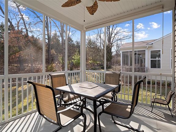 Impressive home in the highly-desirable Heritage of Hawk Ridge. This 55+ gated community offers low maint living and extensive amenities inc clubhouse, pool, tennis, pickleball, fitness center and more. There is a public golf course on site. The ext is low maint with brick, leaded glass door, vinyl siding, exposed agg drive, vert accent siding in the gables, encl fascia-soffits, coach lights, large front porch, prof landscape, lawn irrig and an iron mailbox. Features inc 9 ft clngs, 2 BD, 2 BA, a Flex/LR/DR, wood floors, cust shutters, 2 pnl doors, huge Kit island, granite countertops, staggered height cabinets with crown, SS appl, gas c-top, chimney range hood, tile backsplash, gas FP, main flr laundry, Lux Mstr Bath with walk in shower, raised height dbl bowl vanities and W/I closet. There is a screened in porch and large patio backing to trees. A low monthly fee covers amenities, snow removal (per Ind), lawn care and landscape. Easy access to Hwys 40, 364 and I-70. So much to love!