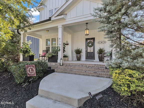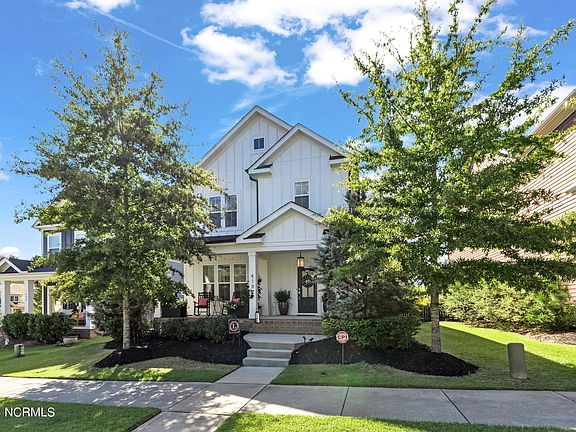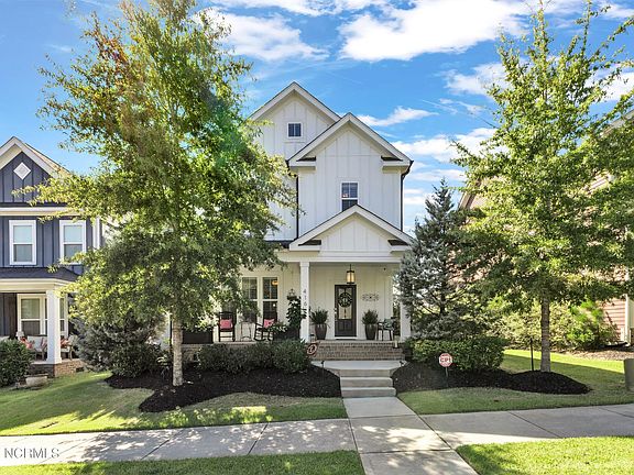 Exquisite HGTV Coastal Farmhouse Beauty in Wendell Falls! From the street curb to the primary bedroom porch balcony, this charmer hits you with ALL the feels!! Spacious covered front porch overlooking the lush manicured landscaping. Step inside to posh decor & custom features galore! Living room Fireplace Shiplap wall with bookcase Built-Ins, Extensive trim package w/ wainscoting & plantation shutters throughout the home, roomy Dining room boasts windows & chandelier! Gorgeous natural colored hardwood floors on both levels & tile bath floors,only secondary bedrooms have carpet. Gourmet Kitchen with breakfast bar island, tile backsplash, farmhouse sink, cascading cabinets w/ under cabinet lighting, pendant lighting, gas stove, rangehood, pantry & SS appliance package! Drop zone off back door w/ Locker cabinet & Barn door cove area perfect for an office w/ a charming Powder room! Primary En-Suite has its own private balcony, beautiful hardwoods, Separate his & hers dual vanity, step in shower, soaking tub, water closet & linen closet, all dressed out beautifully! Generous secondary bedrooms, dual vanity in bath & water closet with shower. Bright & roomy Loft area for office or flex space! Out back you'll love the cozy screen porch with shades for privacy & separate grilling deck! Gorgeously landscape back courtyard area all fence in for your furry friends or little one! Slate stepping stones to the Spacious 2 car garage & parking pad. All appliances convey, Tankless water heater, Smart thermostat...This home has been thoughtfully designed, impeccably maintained & satisfies all you could imagine or need!