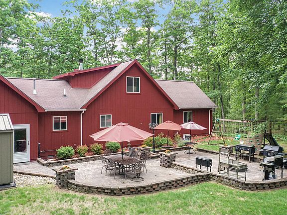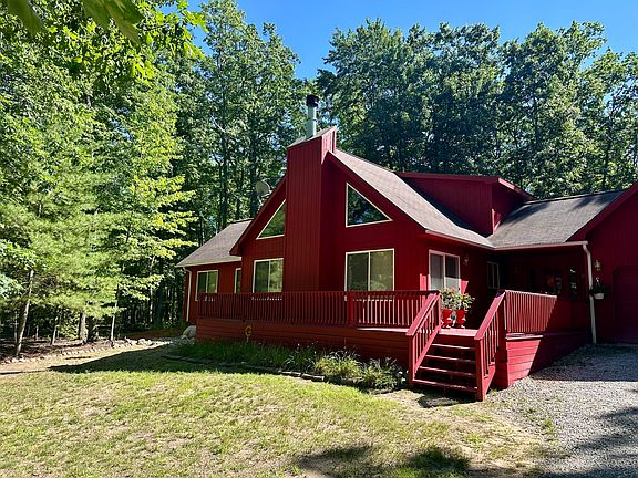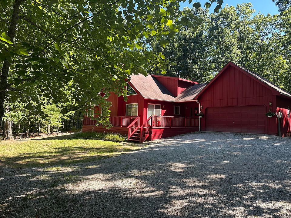 New: if RED isn't your color, see details regarding a paint allowance! Tucked away on a beautifully wooded 1.6-acre lot just 5 minutes from the crystal-clear waters of Higgins Lake, this meticulously cared for 2064 square foot chalet style home can be available for immediate occupancy! Built in 2006, the inviting chalet design is complemented by a spacious 20x24 family room, providing plenty of space for entertaining or relaxing after a day outdoors. The heart of the home is a stunning living area with a wood-burning fireplace, dining space, a conversation nook, and abundant natural light. The modern open kitchen is ideal for cooking and conversation, including a spacious counter with bar stool seating. The potential 3rd bedroom is being used as a media room. There are two Amish built sheds on the property including the most luxurious She-Shed you have ever seen! What a great space for a morning coffee and a good book. The owner has cleared walking paths on the property for peaceful woods walks or ATV rides. Don't love red? No problem! Sellers are offering a $7,500 allowance so you can personalize the home to your taste. If you love red, put the $7,500 toward your closing costs instead!