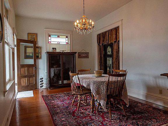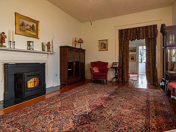 Peaceful living can be found at this Historical home located within walking distance to shopping and dining. This beautiful 4 bedroom, 2 bath Victorian era house has been tastefully preserved with modern amenities. Featuring restored original floors, leaded stained glass windows and a staircase with turn of the century woodwork. The large updated kitchen has space for dining, or use the formal dining room. Living room boasts high ceilings and a fireplace with pellet stove insert. The large, covered front porch is ideal for sitting while enjoying the gentle sound of the creek flowing through the front yard. Or enjoy the warm invite of the sunroom in back overlooking the garden of flowers, then step out onto the open brick patio in that garden, which is fenced in for privacy. Upstairs the large open landing invites one to sit and enjoy the garden view. One car detached garage with off and on street parking. New high efficiency forced air gas furnace and an upstairs mini split and pellet stove assure your comfort. Other recent improvements include storm windows, seamless gutters, composite roof, and cedar fence.