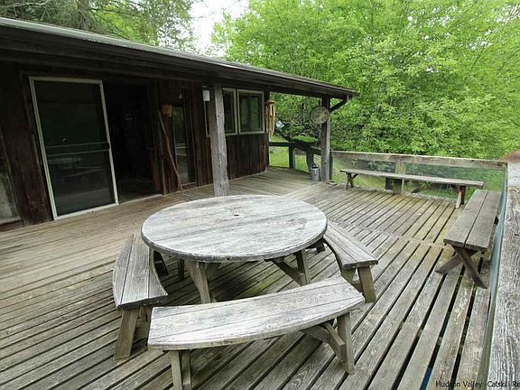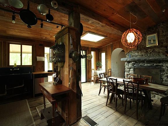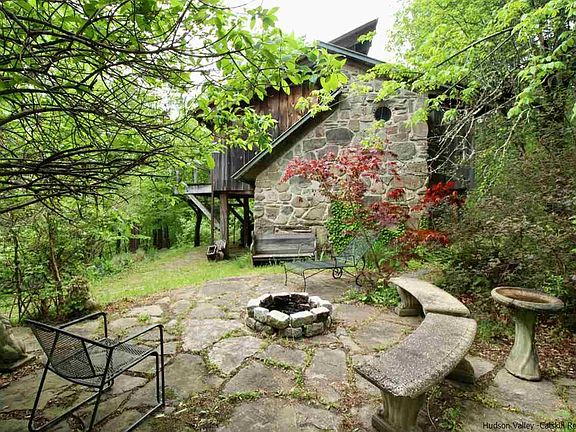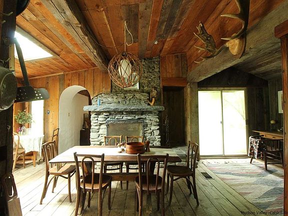 Two barn-style dwellings oozing character. The long living room is punctuated by old wooden beams and alternating ceiling heights, creating a cozy nook, and a dramatic spot where built-ins can be filled with books up to the 10' ceiling. An archway by the wood stove leads into the kitchen and dining areas, which features the gorgeous stone fireplace. Little built-in nooks abound incl. an alcove that has alternately be used as another BR or as a lounge area. There are no doors on that space, but they are easily added. Narrow stairs nr the entry lead up to a master suite tucked upstairs in a kind of romantic crow's nest, feat. a claw foot tub with a view of the grounds from the many windows. The guest apt over the garage also features a wonderful stone fireplace, and an alcove could be another BR. A woodland trail leads to a pond with adjacent creek, while another leads through a meadow with wooden swing and the shed. Tucked into a very quiet, rural area known for hiking and waterfalls.