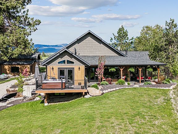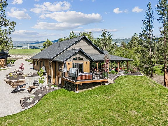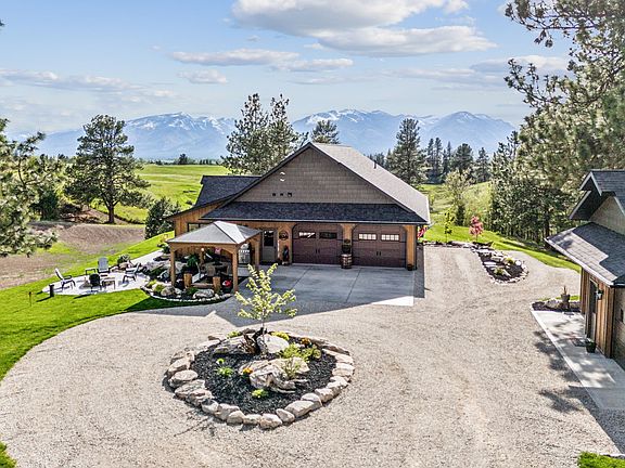 This stunning custom-built estate completed in 2022 is set on over 7 acres of serene, park-like private grounds. This high-end home showcases exquisite craftsmanship, featuring fir and knotty alder trim and beams, and custom alder cabinets throughout. The kitchen is a chef's dream with leathered granite countertops, stainless steel appliances, and meticulous attention to detail. The inviting living room boasts a stone covered gas fireplace, floor to ceiling windows, and glass doors that frame breathtaking views of the Bitterroot Mountains and surrounding water feature. The oversized owner's suite offers direct access to a private patio with a hot tub, as well as a spacious walk-in closet. The bathroom offers a walk-in shower and a soaking tub as well as granite throughout. The walkout basement presents an additional living area, including the third bedroom and bathroom, perfect for guests or family members, only accessed from the outside. Enjoy the comfort of radiant floor heating throughout the entire home. The attached 2-car garage is versatile, currently set up as a salon studio but adaptable for various uses, it features in floor heat, floor drains, a half bath, and a coffee bar. Outdoor living is enhanced by a covered patio with stamped concrete as well as a gazebo and a fire pit, providing an ideal space for entertaining or relaxing. The property is beautifully landscaped, bordered by the Bitterroot Irrigation Ditch, and features multiple ponds. For those needing extra space, a detached 1,000 Sq. Ft. 3-car garage/shop comes equipped with RV hookups and plumbing for a bathroom. Experience the perfect blend of luxury and nature at 416 Hidden Basin Road. This extraordinary property offers unparalleled views, exceptional amenities, and endless possibilities.