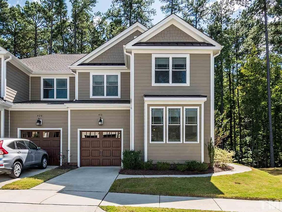 This is the ONE! Meticulously maintained like-new end unit. Enjoy wooded views. Private deck. Huge chef's kitchen w/plenty of room to cook & eat. Open dining & family room. Elegant stone fireplace. Upstairs: wonderful Owner's Suite, beautiful bathroom w/large tiled shower & walk-in closet. 2 more bedrooms & hall bath w/ dual sinks. Perfect community to work & play from home. Comm. pool, playground & dog park. Walk zone to great CH Schools! Quick to I40,UNC, Shopping. EZ to Duke. Welcome Home!