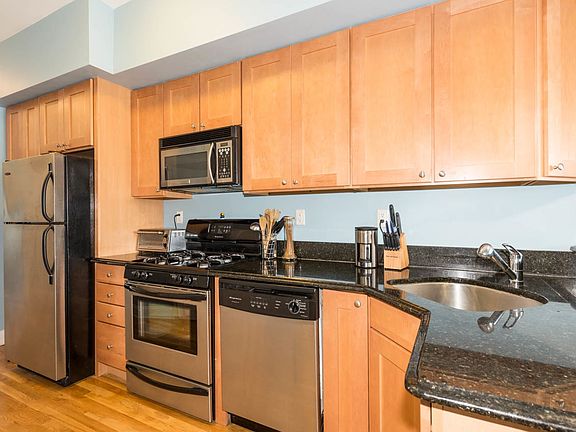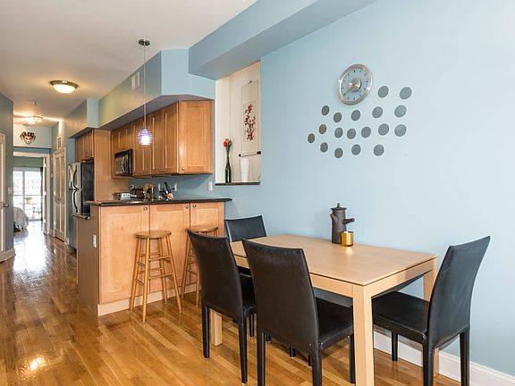 Spacious and bright one bedroom condo with perfect open floor plan and high ceilings. Kitchen features stainless steel appliances, granite counters and breakfast bar. Large bedroom with sliding doors leading to terrace. Updated modern bathroom. Central air and heat, hardwood floors, laundry in home. Additional storage in basement. Impeccably maintained. Close to light rail, PATH, parking, shopping and dining.