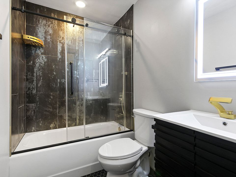 Open floor planRich flooringModern tile backsplashSpacious designer kitchenHigh-end fixturesCustom vanityFull tile work