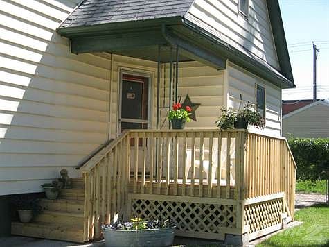 Wow, You will love this renovated charming home with new kitchen and bath, wood flooring. Formal dining plus eating area in kitchen. New Furnace , AC and private fenced yard. NEW in 2013, front porch and back deck, paved walkway and patio. Fenced yard will keep pets and kiddos in.Everyone will appreciate this 3 stall garage/ insulated and finished. BothBedrooms large w/ deep closets. Brokered And Advertised By: C-21 INVESTMENT-REALTORS(r) Listing Agent: Dar Burgard