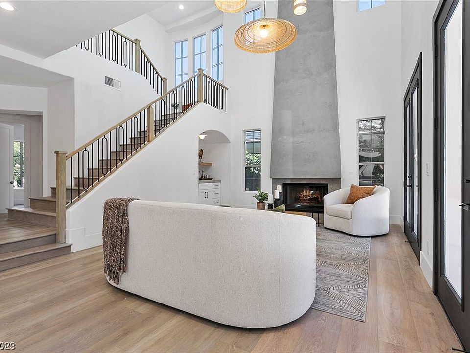 Experience elegance in Summerlin's Eagle Rock Community. Enjoy top-rated schools, parks, golf, dining, and amenities. This 4,222 sqft home boasts professional design in every detail. The great room is adorned with a magnificent gas fireplace that extends to the ceiling, creating a warm and inviting focal point. With 5 bedrooms and 4 baths, it offers versatility and comfort. The chef's kitchen with exquisite quartzite counters combines beauty and functionality. Step into your backyard oasis with a pool, mature landscaping, and a built-in BBQ area for outdoor living and entertaining. Revel in the peace and exclusivity of a guard-gated community. This could be your forever home. Schedule a showing today to discover the timeless beauty of Summerlin living.