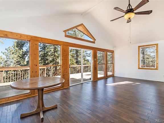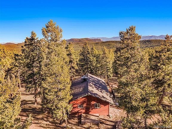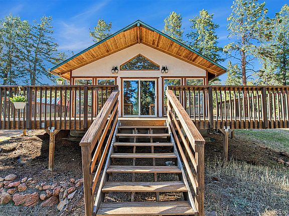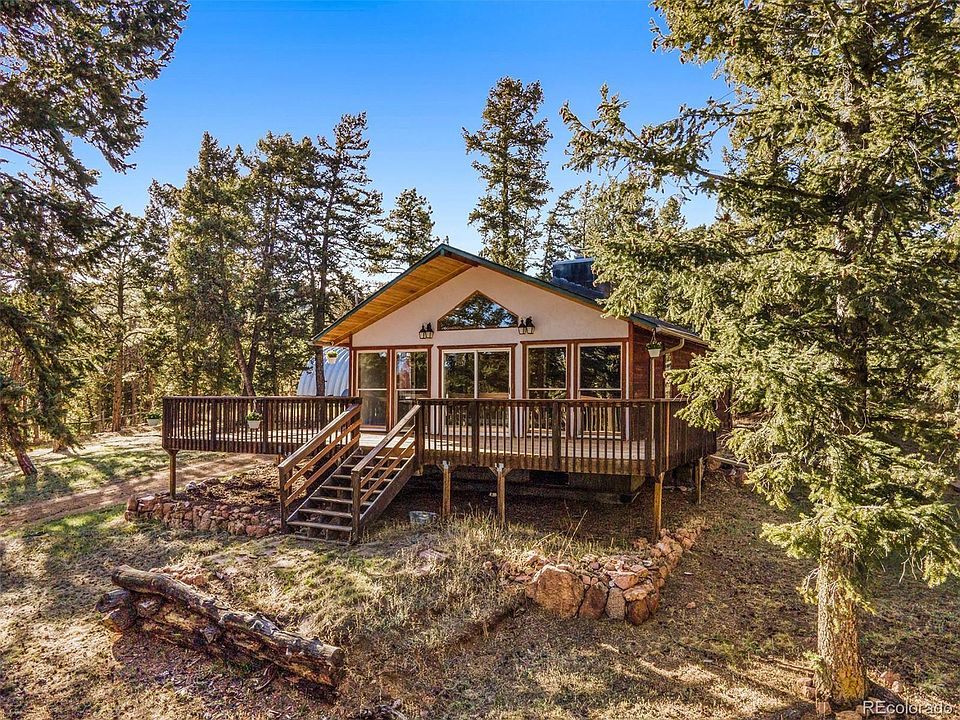 Flooded in sunshine, this 7.4 acre horse property includes a quaint 2-bedroom, 1-bath home ready for you to move-in! Fresh paint and new Pergo flooring let you easily envision your life tucked in the woods while being under 5 miles from HWY 285. Vaulted ceilings, large windows, and a wood-burning fireplace make this home instantly cozy. The large deck off the Living room has great southern exposure and can be enjoyed year-round. There is a large barn with 4 stalls and additional storage area. There is a domestic well which allows for watering horses and gardens. Catch glimpses of mountain views through the trees!