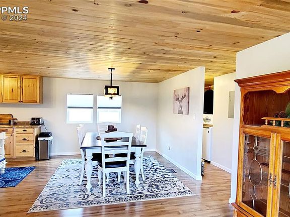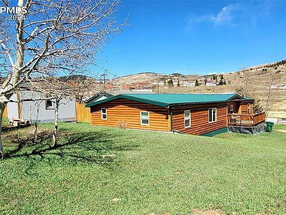 Welcome to this spacious, move in ready home with open layout on 4 lots, in Cul de Sac! A great value with 1667sf, 3/2 full bath has a great space with room for everyone to spread out and relax. Take in the serene mountain valley views and savor the peacefulness of this area, while being close to many adventures in ever growing Cripple Creek- makes it a great investment. Enjoy easily maintained wood log siding, beautiful t&g beetle kill pine vaulted, beamed ceilings. Well cared for, large front deck overlooking park-like lawn, mature aspen, scotch pine, roses, storage shed. Hiking, biking trails just across the street! Completely rebuilt in & out down to studs in 2005; Remodeled 2019; New exterior plumbing/sewer line 2024! Seamed metal roof, seamless steel gutters. Alley access provides entry for future garage/shop. Foyer with built-in bench, coat rack flows into great room, office, master on Left. DR, kitchen, laundry, beds 2 & 3 on Right of home. Family room is large yet cozy, opens to office. Large DR opens to kitchen, features a rustic chandelier, plenty of space for your coffee bar, freezers etc. Kitchen with gorgeous island which can come with the home, is the heart of the home w/ handsome knotty alder & pantry cabinet, touchless faucet. Separate laundry near the kitchen has storage, opens to back of home with new fence-great dog run area! Well suited to gatherings, entertaining, short term rental potential! Huge master opposite end of beds 2 & 3 has full ensuite bath, spacious walk-in closet, beautiful storage armoires. Easy care wood Laminate flooring, smart lights, cordless Levolor blinds. Newer H20 heater, furnace. Near gold medal fishing, Spinney Reservoir for canoeing & water play, near downtown for nightlife, museums, park, community center, gym, fudge, coffee shops, annual festivals and so much more! Pristine, South facing home with plenty of car/RV/toy parking, awaits you. Come see it for yourself & fall in love with this comfy, cabin-like home today!