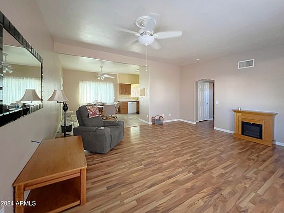Beautiful move-in ready home! Embrace a peaceful lifestyle in this vibrant 55+ community, complete with excellent amenities. Spend your afternoons enjoying the delightful Arizona weather on your front patio or in the Arizona Room! You'll be welcomed by an open-concept layout, stunning flooring, and a cozy freestanding fireplace. Don't miss the generous primary bedroom, which comes with a walk-in closet. This property boasts guest quarters and a laundry room complete with a washer, dryer, and a small freezer! Enjoy peace of mind with the water softener and low-maintenance front and backyards. There is much to appreciate—come visit this home and experience it for yourself!