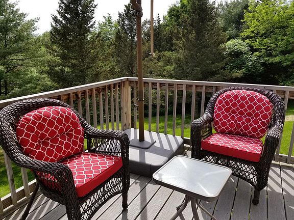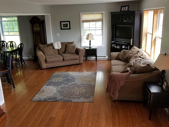 PERFECTLY PRIVATE & SHERBURNE ELECTRIC! This 2007 Contemporary styled Cape Cod home is situated on 4+ acres (two parcels) with lofty VIEWS. Desirable OPEN DESIGN for living rm, dining & kitchen with new bamboo wood laminate flooring and counter seating. Two bedrooms as well as full bath with laundry on first level and 2 spacious bedrms upstairs including Master bedroom suite with attached bath. Property also includes a newer (2016) 3-BAY GARAGE w/ 2nd story for storage or finishing! Garage has its own electric, ceiling fans for ventilation & TV cable! Custom upgrades include Trex deck & concrete patio. Great FAMILY ROOM walks out to the patio for indoor/outdoor events and parties! Two tax parcels, 30-1-68.84 and 30-1-68.85