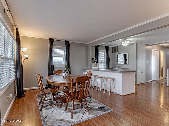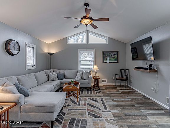 Cute as a button 2 BD / 2 BA brick ranch with a garage in the St. Matthews/Lyndon Area! The open kitchen layout features tile backsplash, stainless steel appliances (to remain) and really cool concrete counter tops with peninsula! It opens directly into the family room/eat-in area. On the right side of the house, you will find two bedrooms and good sized bathroom with a tub for soaking with clever shelving. On the back side, a walk-in laundry room is off the kitchen and towards the back is large primary suite (door allowance with be given for buyers placement of door), with vaulted ceilings, two closets, private deck entrance and includes its own full bath with a standup shower. This room was previously used as 3rd bedroom and could be transformed back into a bedroom easily. Hardwood and tile floors are throughout. Outside, you'll find a wraparound deck, patio, and nice yard space, a detached garage which is great for security and saves your car from the sun and foul weather. Warwick Park is only a few blocks away and the location is hard to beat!
