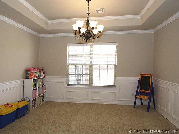 Desirable neighborhood backing to Yorktown...Home features open plan, kitchen w/gorgeous cabinets & 2 cm granite, 2 wood blinds, crown molding. Master bath w/marble whirlpool tub w/separate shower. Office w/French doors & vaulted ceilings. Bixby Schools.