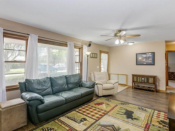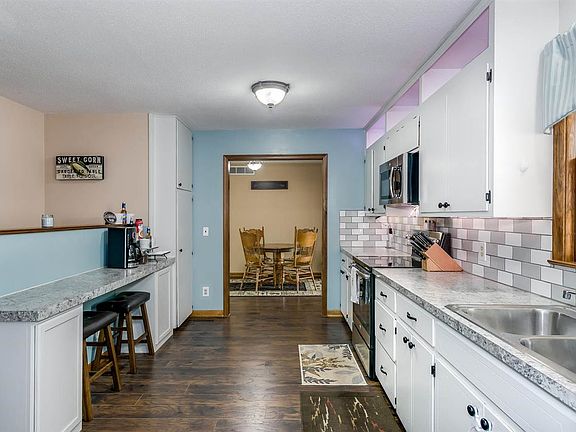 A true charmer in the heart of Sedgwick! This home is located at the end of a quiet street close to the Sedgwick Schools. You will love the covered front porch that adds so much character and curb appeal to the home. Upon entering you will immediately notice the updated luxury vinyl flooring in the living, dining, kitchen and all seasons room. The living room boasts a beautiful stone wood-burning fireplace and opens up to the dining area. The kitchen has been completely updated and includes a coffee bar, eat-in area, under mount, color-changing cabinet lighting and all new stainless steel appliances that stay with the home! The 1/2 bath and laundry room are right off of the kitchen. Both bedrooms, with new carpet, and the completely updated full bath are also on the main floor off of the living room. The partially finished basement includes a family room with a gas fireplace and a non-conforming room that offers plentiful closet space and new carpet. You will also find an abundant amount of storage space, a work bench and utility sink. A true highlight to this home is the all seasons room right off of the dining area. This room has a wall of two sliding glass doors with screens, allowing sunlight to pour in. Step onto your deck and enjoy your expansive back yard that includes garden beds, dog run and a workshop complete with electricity, air conditioning and a work bench. This is a must see!