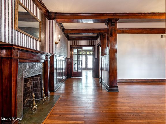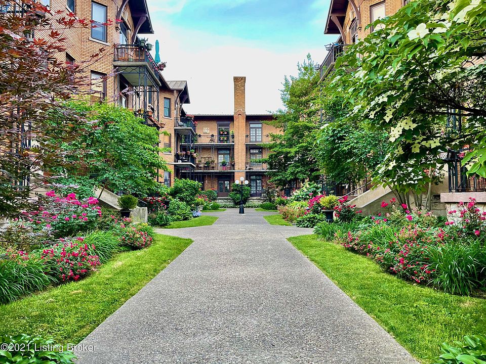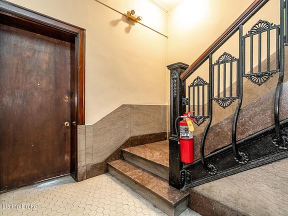 This spacious circa 1913 condominium is located on the 1st floor of the Historic Thierman building on the edge of Old Louisville and downtown Louisville and simply has it all--secured off-street parking, in-unit laundry, private outdoor spaces, loads of additional storage and more. One of the largest units in the building, and one of just a few that has an additional half bath, offering 1,618 SF of living space. Each room is filled with historic charm and character. History abounds in this grand yellow-brick courtyard building designed by architect James J. Gaffney that's been placed on the ''National Register of Historic Places.'' Each of the 24 units have wrought iron railed balconies overlooking the beautifully landscaped courtyard that blooms in rotating colors throughout most of the year. This unit has one of the best views of the courtyard from its balcony that stretches across the entire front faade of the unit. Enter from the main courtyard through a secured entry that opens to an amazing staircase with original marble stairs and vintage wrought iron banisters. Upon entering the home, you'll be greeted with oak flooring, handsome trim and molding, mahogany wainscoting, and a decorative fireplace with tiled surround and wood mantel at the foyer. The large living room features beamed ceilings, fresh paint, and offers several potential sitting/entertainment areas with two incredible built-in glass-paned double door bookcases, and French doors that open out on to the North-facing balcony featuring stunning views of the Thierman courtyard. This spot is perfect for morning coffee, reading, and/or evening wine and entertaining. From the living room through a second set of glass paned French doors you enter the formal dining room with chandelier and another set of doors that lead out to the rear South-facing balcony, crowned with stained glass windows. The dining room flows into the spacious kitchen that has two large windows, ample cabinet storage and countertop space. The kitchen has the potential to be a showstopper with a little bit of updating. Off the kitchen is an additional room that includes a half bath that could be used as a bonus room, office, or a third bedroom. This room leads out to the convenient unfinished storage room and on to the exterior back entrance to the unit. Down the main hallway you'll find two large bedrooms with nicely sized closets. One of the bedrooms has been fitted with custom wood floor to ceiling bookshelves around the perimeter of the room, offering an option for an impressive office or library, and features views into the main courtyard through another set of French doors. The full bathroom is tucked away off the hallway and has a pedestal sink, original white ceramic mosaic tiled floor, and a built-in porcelain tub/shower with white subway tiled walls. Just near the bathroom is a convenient laundry closet that houses opposing full-sized washer and dryer units which will remain. Additional storage for B2 is available in the basement of the building accessed via the back staircase. Thierman includes a gated parking lot with remote entry on the corner of 5th St. and Breckinridge St, just 35 feet from the rear of the building. This sizeable, history-filled condominium home is a rare find on the first floor, and is ready for a new owner to make it their own amazing space. Convenient to dining, entertainment, The Palace and Brown Theaters, and all that downtown Louisville and Old Louisville have to offer.