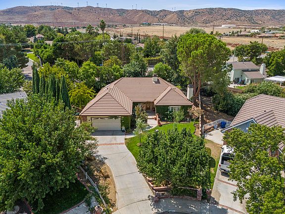 Gorgeous Semi-Custom SINGLE-STORY home in desirable area of WEST PALMDALE! This one you have to see! Very spacious home with upgrades and quality construction throughout. Separate Formal Living Room and Family Rooms both with real brick, Wood-Burning Fireplaces. Family Room also has open wood-beamed ceiling. Remodeled Master Bathroom with bathroom has a dual shower. The main bathroom is a beautiful with a custom tiled tub/shower, stained glass window and skylight. Upgraded Kitchen features custom upgraded cabinetry, granite countertops, microwave plus a 5-burner gas range, double oven and built in refrigerator. All this on an end-of-the-Cul-De-Sac 1/3 acre lot with Park-Like landscaping. Large solar system and so much more!