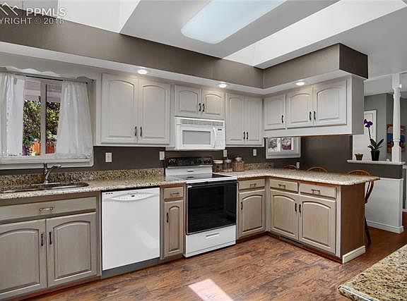 Here is your chance to own a ranch style home tucked away in a quiet pocket of homes. On the main level you will find beautiful laminate flooring throughout. The kitchen is has an open feel and includes granite counter tops, sky lights, a spacious pantry, and a counter top bar area that is the perfect place to grab a quick bite to eat. There is a generously sized living room with a wood burning fireplace with brick surround that is open to the dining area that will easily accommodate the largest of dining furniture sets. There are 3 bedrooms on the main level to include the master bedroom with its own attached private bathroom. Walk from the living room into a flex room that is currently being used as a home office. This area has a cozy feel and the flooring has a decorative concrete overlay. There is a door in this area that leads you to an incredible covered patio in the back yard. You will find yourself relaxing and entertaining here all year long. There is a gas fire pit with stamped and stained concrete and it is the perfect place to end your day. In the basement there is new carpet throughout. There are 2 more bedrooms in the basement, a large family room, and tons of storage space. Air conditioning was recently installed and the electrical service was upgraded to 150amps in 2017. In the garage you find plenty of space to park, extra receptacles, and a 50amp welder circuit. The back yard has plenty of space and includes 2 shed areas for additional storage. This gorgeous home is positioned on a level corner lot with mature trees and is minutes away from shopping, schools, parks, trails, and UCCS. Set your showing today!