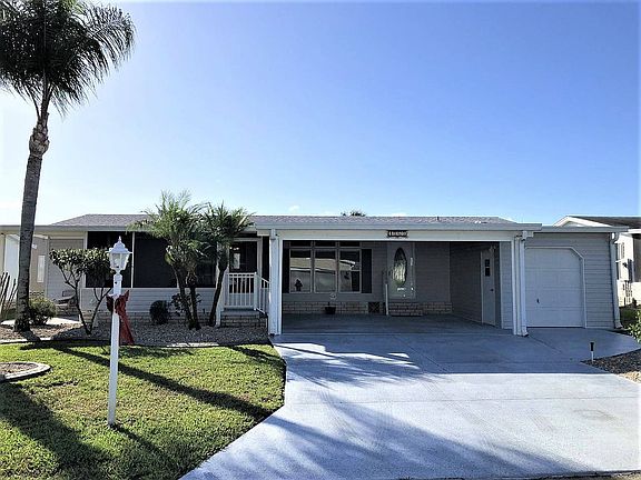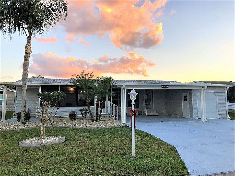 3 BR 2 BA 1560 SQ FT, Partially furnished. Open, Split floor plan. New laminate floors, new carpet in bedrooms, fresh paint, New refrigerator and microwave, washer and dryer, Screened lanai, with a covered front porch, professionally landscaped, Immaculately kept and maintained. Double carport plus golf cart driveway and golf cart garage. Large eat in kitchen with loads of cabinets. Spacious Master bedroom large enough for a king sized bed. Double sink vanity in master bath, plenty of walk in closet space. This home has a separate laundry room.