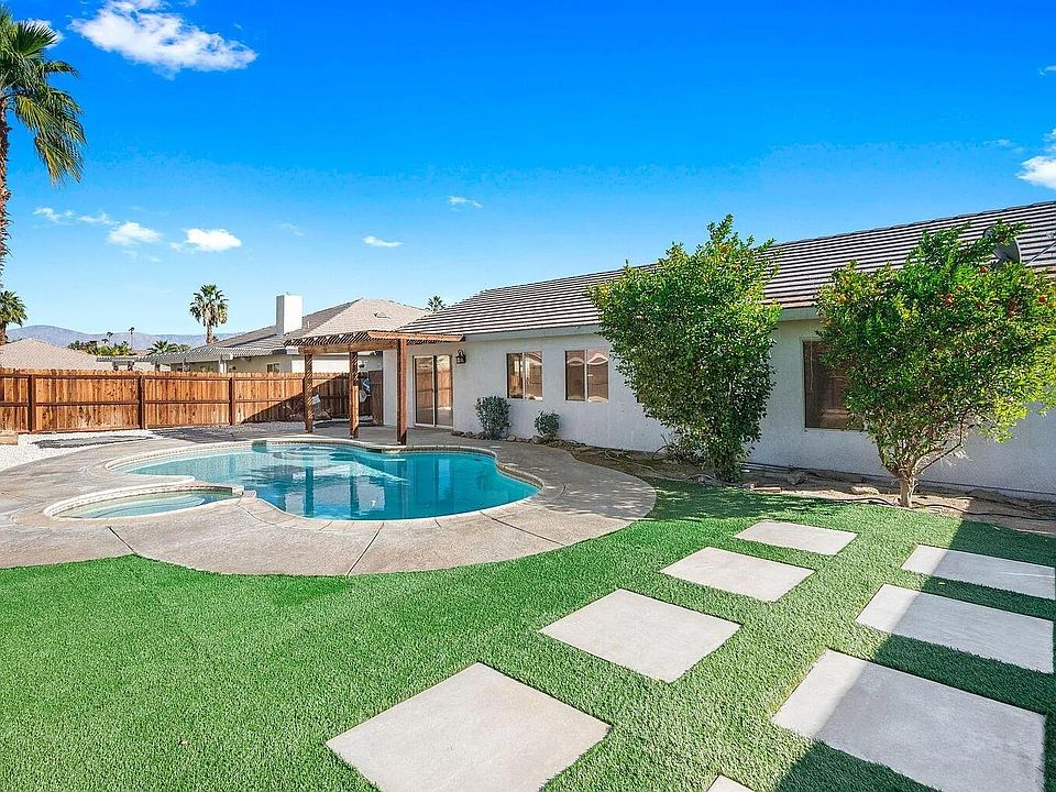 READY TO RENT Home is being rented UNFURNISHED for a long-term lease only, 12 monthly minimum. This is not a seasonal rental. Located in a quaint area of Bermuda Dunes ! With an excellent location, this charming and spacious single level home is ready for you. With a light and bright open floor plan, the possibilities are endless. With vaulted ceilings and recessed lighting, the large kitchen opens to the entertaining area. The spacious main bedroom has an attached bath with double sinks, separate tub & shower, and the 2 additional bedrooms have full baths. The spacious and private backyard boasts a pool, spa, fruit trees, and mountain views. The home also has a high efficiency AC unit, a 2-car attached garage, a large driveway and is ideally located in the Imperial Irrigation lower cost utility district very close to Palm Desert with convenient access to shopping, dining, tennis gardens, golf, excellent schools, and freeways. Some other highlights include new LVP flooring throughout, new blinds in all windows, freshly painted exteriors and interiors, new microwave, dishwasher, gas stove, burner kit for the water heater, pool filter, pool light, pool pump and removed pool waterline recently. Security deposit $3,500 due at signing. A small pet is okay with an additional deposit to $300. 25LBS MAX. (if applicable) The owner pays for weekly gardening and pool service. The owner pays for weekly gardening and and pool service.