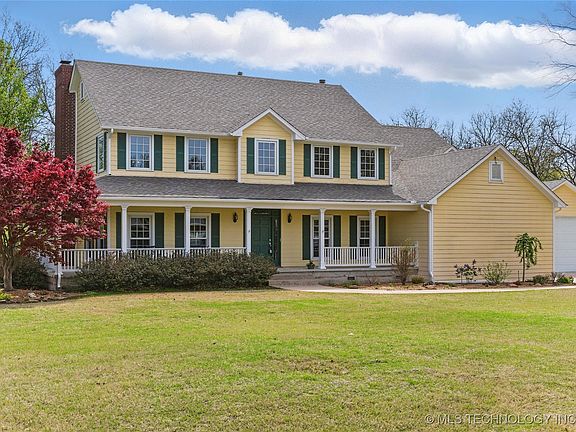 Charming and just like a Nancy Meyers movie! This beautiful farmhouse style home with a Wrap Around Porch is move-in ready for you: New Paint, New Anderson Windows, fully encapsulated Crawl Space, Newer Roof, Newer Detached RV Garage with mini-split A/C, plus a full 3 Car Garage + Shop! Hardwoods throughout, Formal Living & Dining, Great Room with Wood Burning Fireplace, 4 generous Bedrooms, a Loft Library, and the Primary Suite has a private Craft Room! Dream Utility Suite with laundry chute and a Second Half Bath, whole home Generator, full Sprinkler System, and no HOA! This home is located in the "trifecta" area - Creek County taxes, Jenks Schools, City of Tulsa Service close!