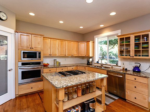 One level living on a spacious .34 acre lot w/mature landscaping. 4Bd/2Ba home is beautiful on the inside & out! High ceilings in living rm w/gas fireplace & generous windows, newer hickory wood floors throughout much of home. Granite, gorgeous island, subway backsplash & stainless appl in kitchen. Master en suite has wood floors, private deck, jetted tub, & large master closet. Fully fenced yard, storage shed, 3 car garage, RV parking.