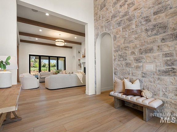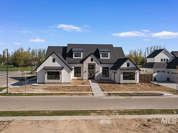 Welcome to this exquisite 4-bedroom, 4.5-bath European-style luxury home in Eagle. Nestled on a .44-acre lot, this 4,356 sq ft single story residence is thoughtfully designed for multigenerational living with a complete second living quarters featuring a full kitchen, laundry, and private entrance. This space would make a great Mother in Law suite, nanny quarters or business space. The main home showcases soaring vaulted ceilings, a gourmet kitchen with double islands, Thermador appliances, a large pantry, and an open concept living space centered around a custom fireplace. The expansive back patio with a double-sided fireplace offers seamless indoor-outdoor entertaining. Additional highlights include a heated master bath floor, a large home office, integrated speakers, a flex room, and a yard ready for your dream pool.