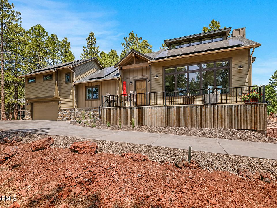 Enjoy views of the San Francisco Peaks from this Mountain Modern meets Contemporary Industrial home in Flagstaff Ranch GC community. Beautiful finishes and details throughout. Two master suites, one on the main and another split for guests. The guest suite has its own LG mini-split heating and cooling system. The home includes a separate guest/office on the main floor with a built-in wall bed and sofa. The gourmet kitchen includes Kitchen-Aid appliances with induction range, French door refrigerator and custom stone island. Stained concrete flooring incorporates the radiant heat/cool for perfect temperature control on the main floor. This custom-built Energy Star certified home has a Home Energy Rating system score of -22 (HERS Index). The passive solar design features south facing windows for winter heat gain and deep overhangs for summer shading. Enjoy near $0 energy costs in this net zero home with thirty 320-watt photovoltaic solar panels. The extended garage has ample room for cars and toys and is wired for EV's. A coveted social membership available for purchase.