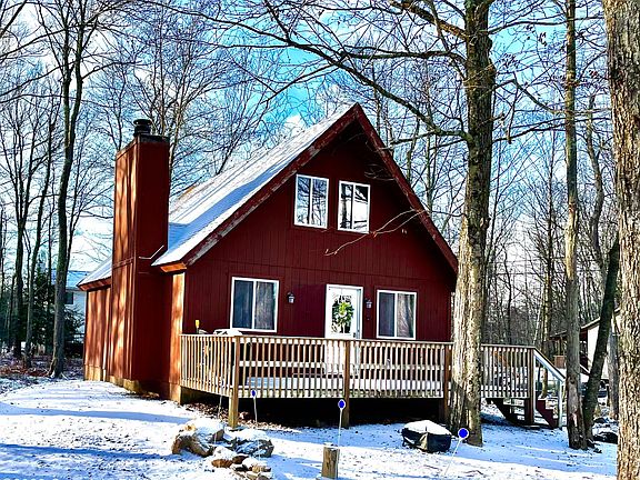 Adorable 3 Bed + Loft, 2 Bath Chalet Home located in Amenity Filled Community, Active Short Term Rental Property sold Fully Furnished! Cathedral Ceilings Living Room Open To Kitchen w/ Eat In Area. 2 Nice size Bedrooms & Full Bath Complete First Level. Upstairs Boasts Large Bedroom, Loft & Full Bath. Must See Tongue and Groove ceilings w/ Accent Beams! All New Windows, All new Flooring & Bath Baths Remodeled! Large Shed in Back perfect for Storage, Nice size Deck great to BBQ on and Enjoy Your Coffee. Great investment, Vacation Home or 1st Home. Very low taxes! Close to all major attractions, Kalahari, Mount Airy Casino, shopping and Interstate 80, hiking, Tobyhanna State Park! STR Permit in Place though 2025!!