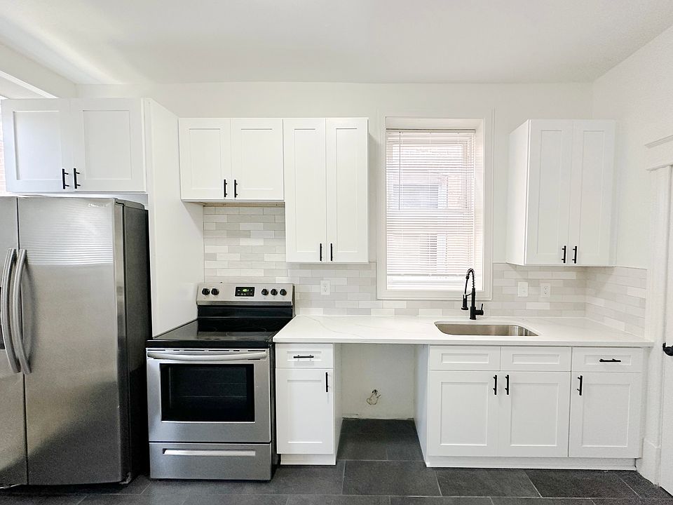 Sleek kitchen with quartz countertops, stainless steel appliances & tile backsplash