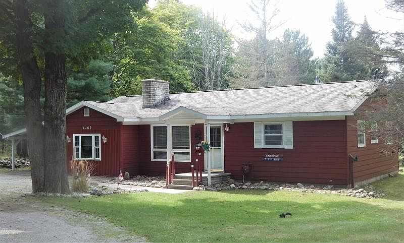 Cozy ranch with 2 bedrooms and 1 1/2 baths. Open floor plan with dining area. Galley kitchen. Natural fireplace in Living Room. Gas Ht. Wtr. Heat. Stackable laundry. Large deck on back of house has a beautiful view of some woods. Work room that was once a single garage, Carport next to that. Michigan basement, a great getaway home! Located in Lost Lake Woods Club with all it's amenities. One membership will transfer with sale.