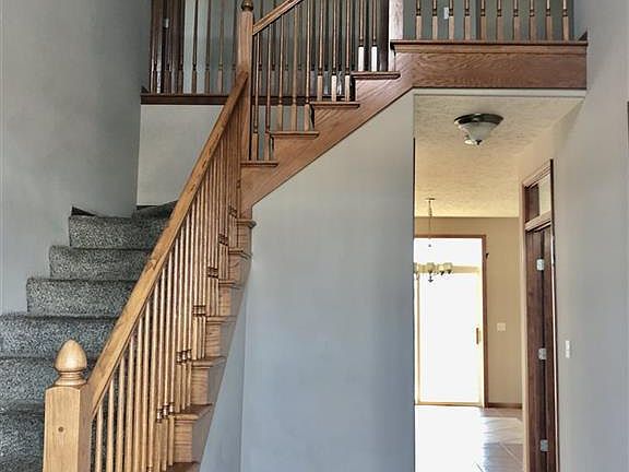 Spacious 4 bdrm, 2.5 bath, formal living & dining rooms, family room open to eat-in kitchen. Covered front porch, two story foyer has spindle staircase, 9' ceilings thru-out, tray ceiling in LR & DR. Kitchen has 42" upper cabs, raised panel, can lights, granite counter tops & dining area. Solid 6 panel doors with transoms. Family room has hardwood floor & full brick front fireplace. Upper level incl. A spacious master w/cath ceiling, bath has dbl vanity, jetted tub, shower & W-I closet, 3 additional bedrooms and a hall bath complete the 2nd floor. Low maintenance brick/vinyl exterior, 3 car att garage, full basement for potential expansion with quiet small town living. Sold "as is". All room dimensions approximate.