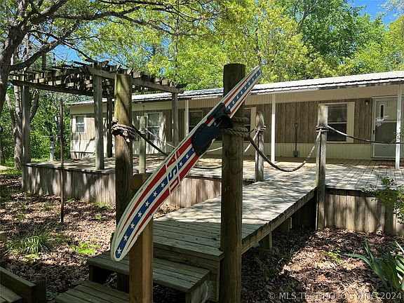 Extremely well kept home on lake Eufaula. This property is nestled into a beautiful wooded corner lot. When you enter the property you land right under a steel 2 car carport. Then onto a huge front deck extending 40 feet of the house. The deck sports a Pergola on one end of the open deck and a full cover over the back side of the deck. When you enter the home you will discover an open floor plan Living to Kitchen with an enclosed utility with added cabinets for your pantry needs. Master is spacious and has a large Bath with walk-in closet. You will not find a nicer house for this price. Boat Ramp in the neighborhood. Home has Septic with Lateral and a 220 ft. deep water well. This is a must see property.