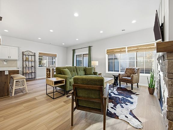 Stone accent gas fireplaceSeparate pantrySolid surface countertopsTile backsplashGas rangeWonderful primary bedroom suiteHeated floors