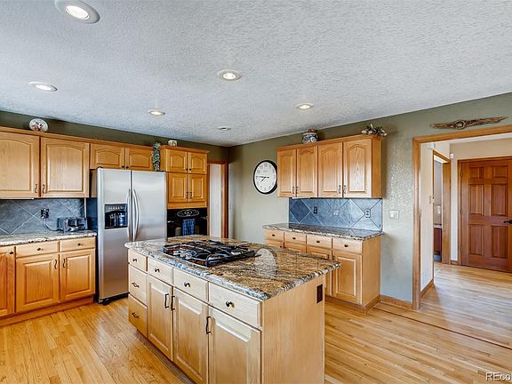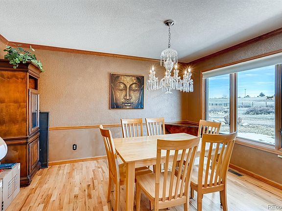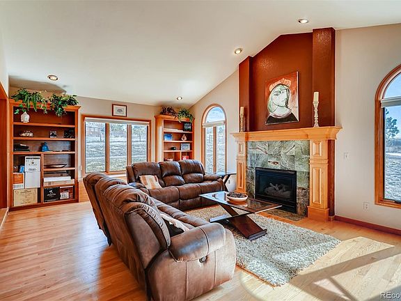 A little bit of paradise on almost 5 acres! Panoramic front range views and spectacular sunsets! Main Floor features huge country kitchen with island and eating space, large great room with fireplace, and a formal dining room. Master bedroom with 5 piece bath, and two bedrooms and full bath are upstairs. Walkout basement is finished with a media/family area, two bedrooms a full bath and two storage rooms. The large 48'x48' barn is complete with water, electricity and 2 stalls with plenty of room to expand. An added bonus - beautiful inground pool and patio water feature, custom firepit with benches for outdoor living! And, did I mention - beautiful sunsets! The community has a vast network of dedicated equestrian trails and the property is just a couple of miles away from Colorado Horse Park. Actual lot size is 4.93 acres.