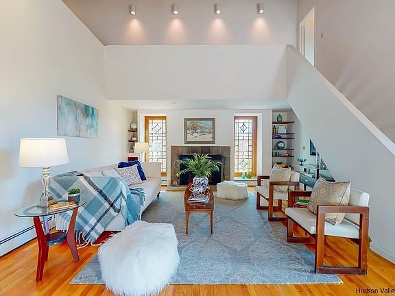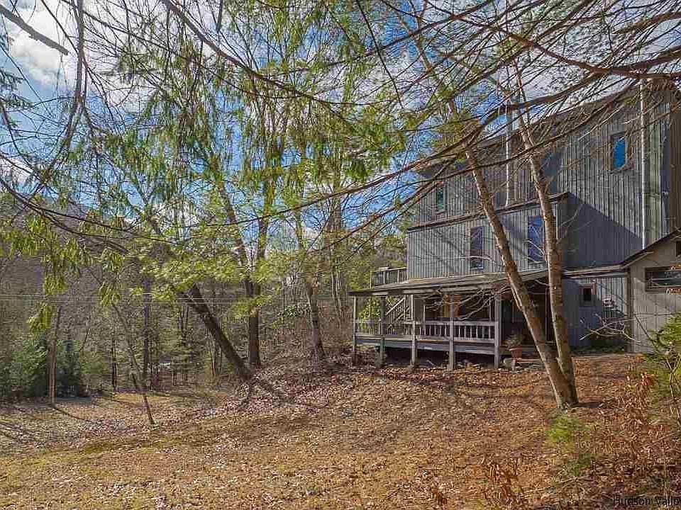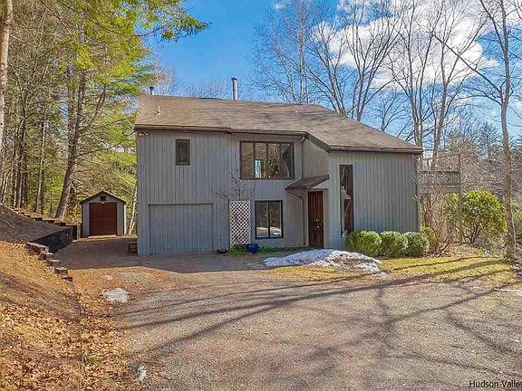 This lovely Lake Hill custom contemporary will steal your heart! A wonderfully spacious home with light filled open floor plan, two story vaulted ceiling, beautiful red oak flooring, handsome wood burning fireplace, generous sized windows and glass doors that frame the natural woodlands and awesome mountain views. Over 2,000 sq ft on three levels of living space, the first floor includes a spacious family room, two ample bedrooms, full bath and access to large covered patios that overlook the side yard and sprawling backyard. As you look beyond the tree line you'll see the meandering streams and beaver pond. Explore this wooded wonderland and beyond because this property is bordered by DEP land, which truly offers privacy and protection.The second level is the heart of the house, the great room, with efficient galley kitchen, large living room and dining area that has direct access to the entertaining open deck that overlooks the magnificent mountain views. In addition there is a main floor full bath and the primary bedroom. Vaulted soaring ceiling and floating style staircase gives the impression of endless space and beckons one to the third floor that has full height loft style home office and an additional room that is perfect for a home gym, meditation room or cozy office. There are three outbuildings on the property, two were originally rustic summer cabins that have great potential as studio spaces, add some TLC and imagination and the sky's the limit, they are in "as is" condition. The other outbuilding is an oversized storage shed. This home is located in Lake Hill, a magical little hamlet of Woodstock, and has easy access to to Rt 212 and all local amenities.