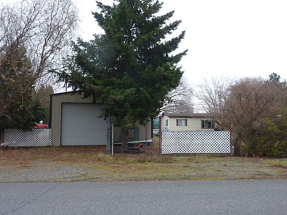 Level large corner lot.Fenced with 3 gates.Detached 32x24 steel shop,wired & insulated with 2 garage doors&openers.Solid 1979 manufactured home,newer roof,newer electrical panels.270 sf unheated addition.2 RV hookups.Sewer dump out.Central heat & AC. Pellet Stove.8x12 shed.16x21 carport.Wood deck. Parking for vehicles/RVs/boats.Drip irrigation.Fruit trees.Property taxes only $753/yr. All kitchen appliances,washer,dryer included.
