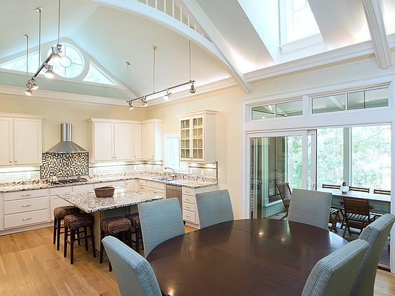 Completely renovated in 2012 and rebuilt by the award-winning Buffington Homes according to architect Marc Camen's design, 417 Amaranth offers unique architectural details including vaulted ceilings with exposed arched beams and sunlights, French doors, and shiplap walls. During the total renovation, ceilings and the home itself were raised, hurricane-rated windows added, and the roof entirely replaced. Today it's a perfect blend of contemporary design with island style, an ideal vacation getaway for a large family or group of friends. The fully equipped kitchen features stainless steel appliances, granite countertops, subway tile backsplash, a range hood, and a large island with additional seating and storage. Guests will be drawn to the kitchen with its long view of the living space. The dining area is comfortably nestled between the kitchen and living room, and looks out through large sliding glass doors to the south-facing screened porch: the perfect place for al fresco dining or enjoying a morning cup of coffee while listening to the sound of the ocean waves. Family and friends will gather around the fireplace or escape to the sunroom for a restful evening. Upstairs, the spacious second-floor master bedroom includes a king size bed, vaulted ceilings, and a luxurious bathroom with exquisite tiling, a double vanity, soaking tub, and large walk-in shower. A small daybed on the second floor is perfect for younger guests. A first-floor master suite features a king size bed and private bath with double vanities. A third bedroom is furnished with a queen bed; the fourth bedroom has two full beds, ideal for a vacation rental option. This move-in ready home is fully furnished. Conveniently located just beyond the main gate, 417 Amaranth is a short walk to the Island's ten-mile beach and offers easy access to The Sanctuary, Sandcastle, Night Heron Park, award-winning golf courses, and the shops and restaurants at Freshfields Village.