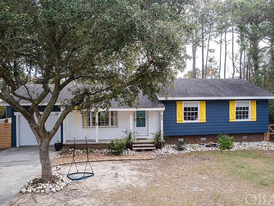 Adorable ranch home in the heart of Kill Devil Hills, with garage and fenced yard on an oversized lot! It's close to the beach and Nags Head Woods Preserve, and so many dining and shopping options nearby. The covered front entry and brick exterior give the home great character and curb appeal. The spacious primary bedroom easily fits a king size bed, has two closets and it's own en suite bathroom. The two other bedrooms share a full bath in the hallway. There is a laundry room with storage. The kitchen features white cabinets, butcher block counters on one side and stainless steel appliances. There's a door from the kitchen into the garage, and on the other side of the kitchen, there are new sliders that open onto the screened-in porch. There's an additional deck off of the screened porch and plenty of yard space plus a fire pit area! The owners have loved the neighborhood and its central location to the beach, shops and everything they need. X-flood zone so flood insurance is not required! Ask me about an interest rate buy down product!