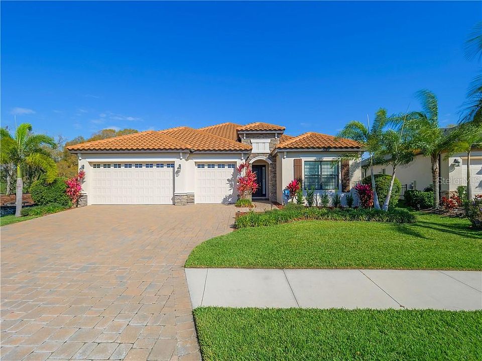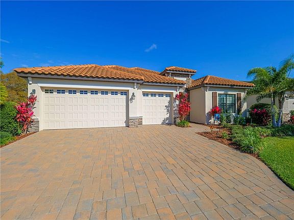 This is THE one!! This meticulously cared for home is practically brand new, having been purchased as a 2nd home for retired snowbirds staying for just a few months at a time. Upgrades abound inside and out! The designer barrel tile roof grabs your attention as you approach. Upon entering, you'll find a calm and inviting neutral palette, ready for your personal touch. The vaulted ceilings, highlighted in the great room by wood beams, 18" floor tiles laid on a diagonal, and plantation shutters are additional reminders of the upgrades in the home. Along with stone counters and deep espresso maple cabinets throughout, the kitchen's stainless steel appliances, above and below cabinet lighting, 4-person breakfast bar, and 7' long island wow. The master bedroom boasts separate his-and-hers vanities & closets and a walk-in shower. Privacy abounds with the remaining 3 bedrooms situated on the opposite side of the home. Invite the outdoors in with the oversized sliding doors in the great room and master bedroom. Step out back and you will find a beautiful pavered lanai and pool deck that surround the self-cleaning saltwater pool. If the kids or dogs are restless, send them to either side of the home, knowing they will be kept safe within the black aluminum fencing. The backyard oasis is further accentuated by the conservation area behind the home with the sights and sounds of Florida wildlife. Save $900 each year on property taxes with the CDD Bond already paid in full! Greyhawk Landing provides many options for activities! Miles of walking trails traverse the vast community, taking you to the 2 separate resort-style pools and spas, playgrounds, tennis/ pickleball/ basketball courts, baseball/ softball/ soccer fields, fitness center, and ponds. Be as active as you choose here in Greyhawk!