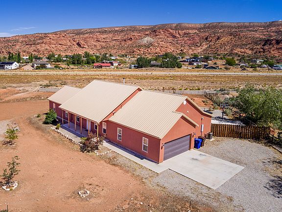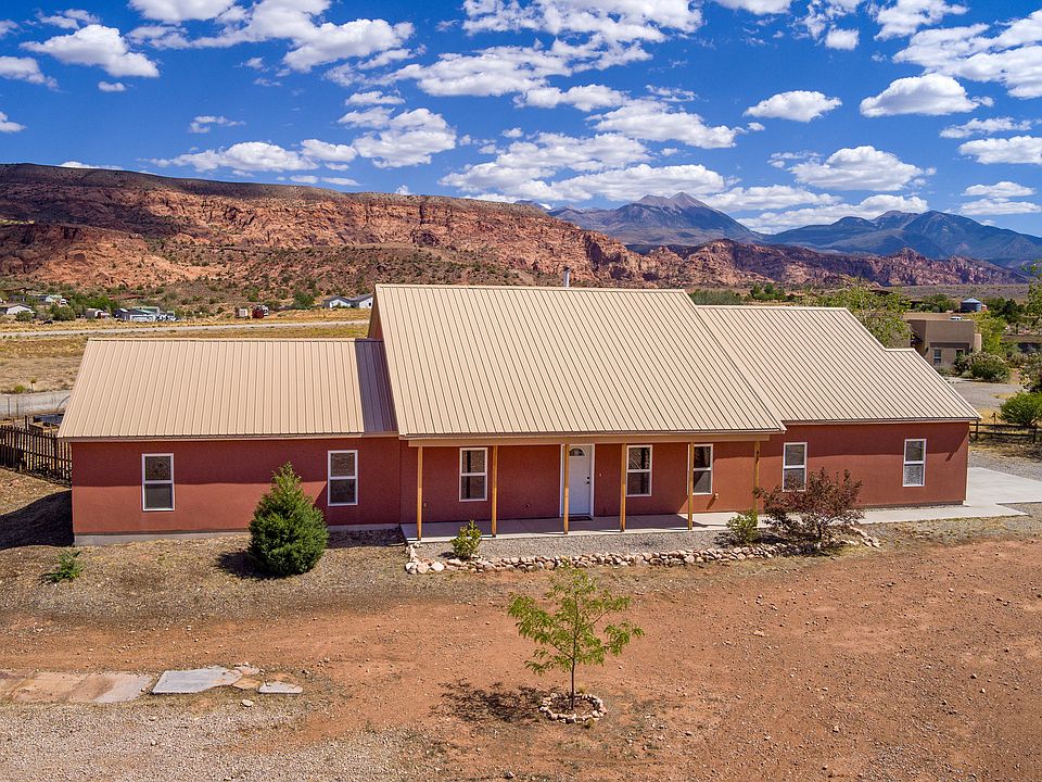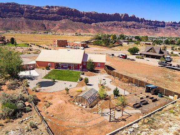 CHARMING MOAB RETREAT with Red Rock Views & Backyard Oasis. Welcome to this amazing 4-bedroom, 2-bathroom home on nearly an acre (.88 acres), perfectly blending comfort, style, and outdoor living. Nestled against the backdrop of Moab's world-famous red rocks, this property offers the ideal balance of indoor warmth and outdoor adventure. Step inside to a spacious living room and kitchen, complete with custom hickory cabinets, arched doorways, and a cozy wood stove. A versatile game room, including an Italian Slate Pool Table and a 10x12 storage loft, provides endless possibilities for entertaining or hobbies. From the dining area, a sliding glass door opens to a covered patio, perfect for morning coffee or evening gatherings. The backyard is a true oasis-with solar-lit pathways, grassy areas, a fire pit, Walipani greenhouse, raised garden beds, and an in-ground trampoline. With newly planted fruit trees, grapes and berries, you will enjoy fruit in the years to come. This is all set against breathtaking sunrises over the La Sal Mountains. Additional highlights include a front covered veranda, ideal for morning relaxation soaking in the stunning red rock views. Don't miss the chance to own this one-of-a-kind property that combines charm, functionality, and the natural beauty of Moab. Some furnishings may be included. All info deemed to be reliable but buyer to verify all.