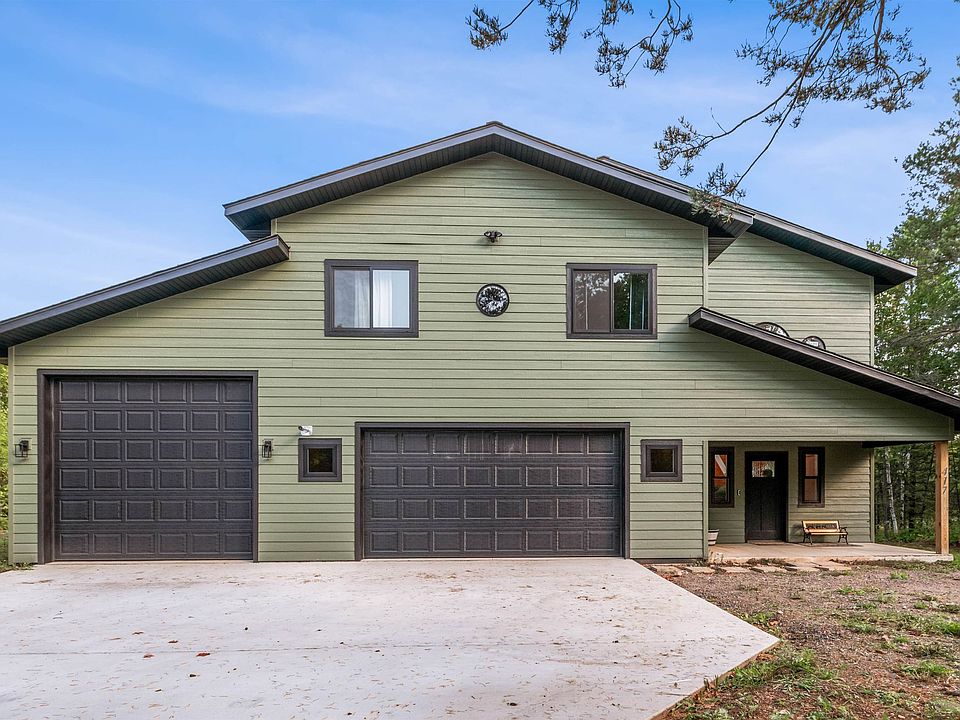 One-of-a-kind new construction on 2 private acres in desirable rural East Duluth, offering over 3500 sq ft of modern design, thoughtful functionality, and high-end finishes. The home features 5 bedrooms, including a main-floor guest room and an impressive upper-level master suite with two walk-in closets. The spa-like master bath boasts a double vanity, soaker/bubbler tub, and a walk-in tile shower with color-changing lights, music, wall jets, and rainhead shower. Two additional bedrooms share a full bath, while a fourth connects to a versatile office/studio with an exterior door to a future balcony. All baths feature rainhead showers and heated/lit mirrors. The upper level offers a laundry room with a ventless washer/dryer and a laundry drop from both baths. Nearly all lighting is dimmable, temp-adjustable LED. Ethernet wiring is in place for the living room, master, office, and an adjacent bedroom. An attached 26x26 heated/insulated garage leads to a flex mudroom space, pre-plumbed for a dog wash, connecting to a 15x60 heated garage with a 12-ft door, RV hookup, and side access. Built slab-on-grade, the main floor features a bright living room, under-stair dog room, and a unique cat room with viewing windows, odor-control ventilation, and safe indoor/outdoor access. The gourmet kitchen is the heart of the home, with black stone counters, black cabinetry, slide-out storage, dimmable under-cabinet lighting, massive island with outlets, double wall oven, flexible fridge, and walk-in pantry. Outdoors offers a large patio, hot tub setup, roughed-in electrical for a 12x12 outbuilding, and space ready for your landscaping vision.